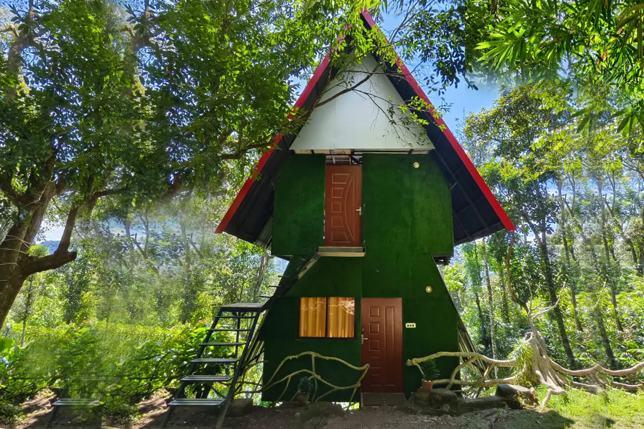 Experience A-frame cabin with breath taking views in scenic Munnar. A-frame house is a rare building form in which the gable roof almost extends to the ground. As the name suggests. An A-frame building is an architectural style of building that features steeply-angled sides (roofline) that usually begin at or near the foundation line, and meet at the top in the shape of the letter A.